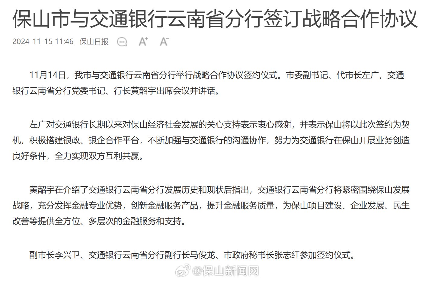 云南省分行举行战略合作协议签约仪式。市委副书记、代市长左广,交通银行云南省分行党委书记、行长黄韶宇出席会议并讲话。