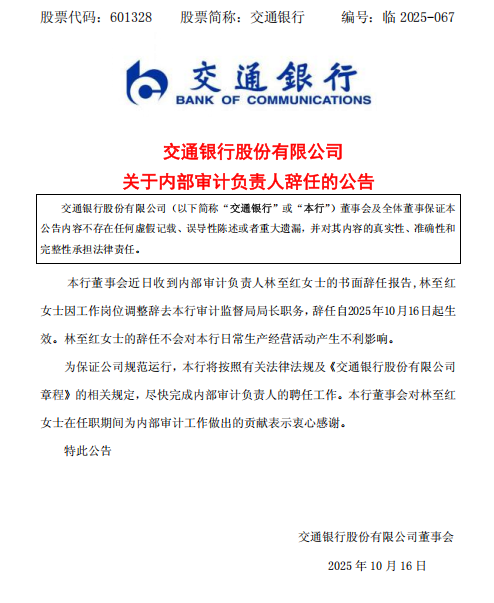 林至红辞任交通银行审计监督局局长职务