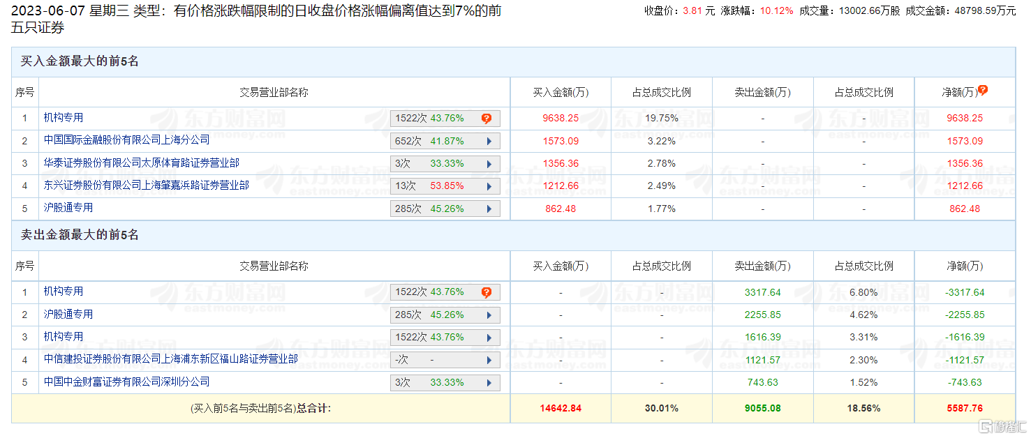 格隆汇6月7日丨广深铁路涨停,换手率2.30%,振幅6.65%,成交额4.88亿元。龙虎榜数据显示,今日共3个机构席位出现在龙虎榜单上,分别位列买一、卖一、卖三,合计净买入4704.21万元。今日龙虎榜单上出现了沪股通的身影,占据了买五、卖二的位置,净卖出1393.37万。今日榜单上出现了一家实力营业部。买二为中国国际金融上海分公司,该席位买入1573.09万元。近三个月内该席位共上榜1257次,实力排名第4。