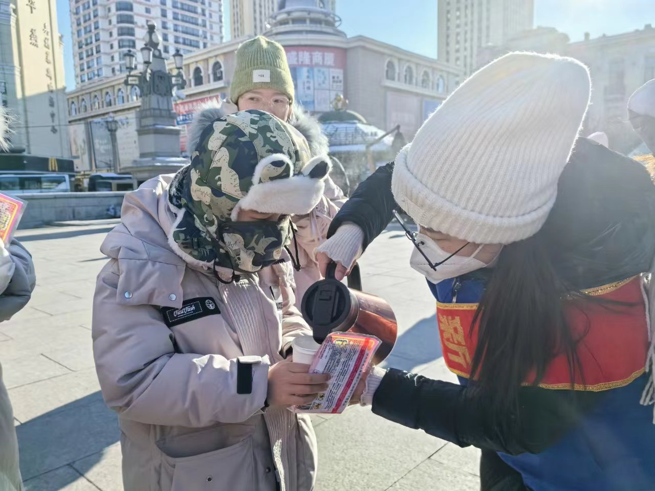 新华保险黑龙江分公司位于道里区索菲亚商圈,外地游客集中,为了提升游客冬季旅游体验感,公司将职场一层全面开放,面向外地游客及户外工作者免费提供热饮及休息、取暖、如厕、行李寄存等服务。2月1日,新华保险黑龙江分公司联合哈尔滨中支的志愿者们走上街头宣传公司驿站,欢迎大家随时进来取暖休息,同时为外地游客和户外工作者送去了红糖姜茶和暖贴,为寒冷的冬季增添了一抹暖意。游客们表示,哈尔滨人的热情已将浓浓的寒意驱散,这趟“尔滨”之旅留下了深刻的印象。