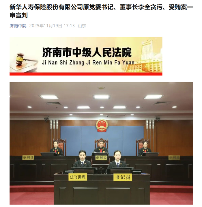 11月19日,山东省济南市中级人民法院对新华保险(601336)原党委书记、董事长李全贪污、受贿案进行一审公开宣判。