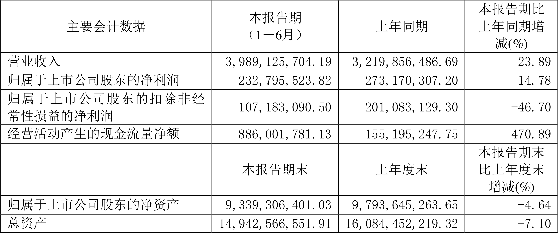2024年上半年,公司经营活动现金流净额为8.86亿元,同比增长470.89%;筹资活动现金流净额-11.20亿元,同比减少11.14亿元;投资活动现金流净额2473.48万元,上年同期为-2.04亿元。