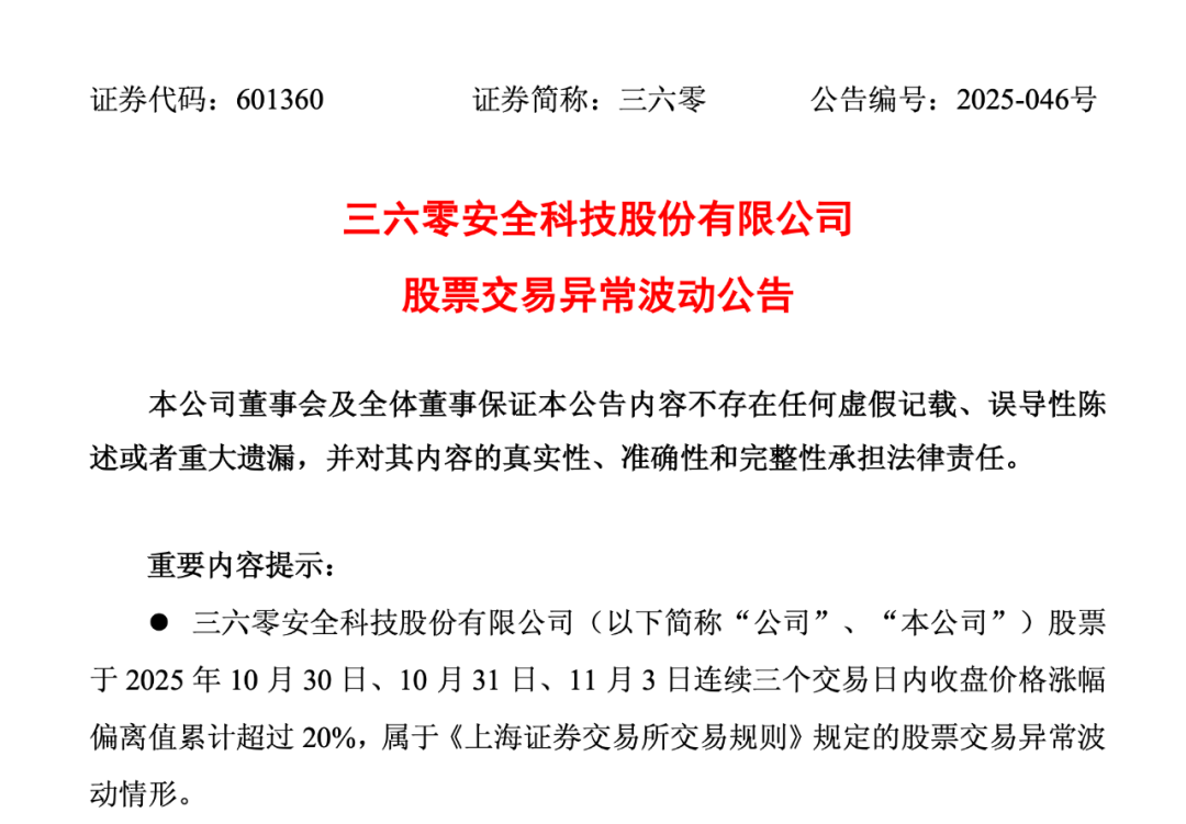 金融虎讯 11月4日消息,日前,三六零安全科技股份有限公司发布股票交易异常波动公告。公告显示,公司股票在2025年10月30日、10月31日、11月3日连续三个交易日内,收盘价格涨幅偏离值累计超过20%,符合《上海证券交易所交易规则》中规定的股票交易异常波动情形。