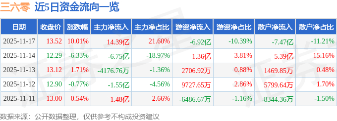11月17日的资金流向数据方面,主力资金净流入14.39亿元,占总成交额21.6%,游资资金净流出6.92亿元,占总成交额10.39%,散户资金净流出7.47亿元,占总成交额11.21%。