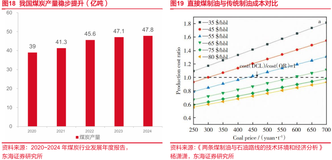 部分煤资源丰富地区,煤制油,煤制天然气相比传统制取方式有较大成本优势。根据《两条煤制油与石油路线的技术环境和经济分析》的测算,油价在55-80美元/桶的区间内,煤炭价格低至400元/吨时,直接煤制油(DCL)相对于传统制油(OR)有较好竞争力。截至2026年1月27日,布伦特原油价格约为68美元/桶,而新疆哈密地区坑口价动力煤约为350元/吨左右,如果在新疆当地工厂进行制油,无论是直接制油还是间接制油,相比传统制油均有显著的成本优势。