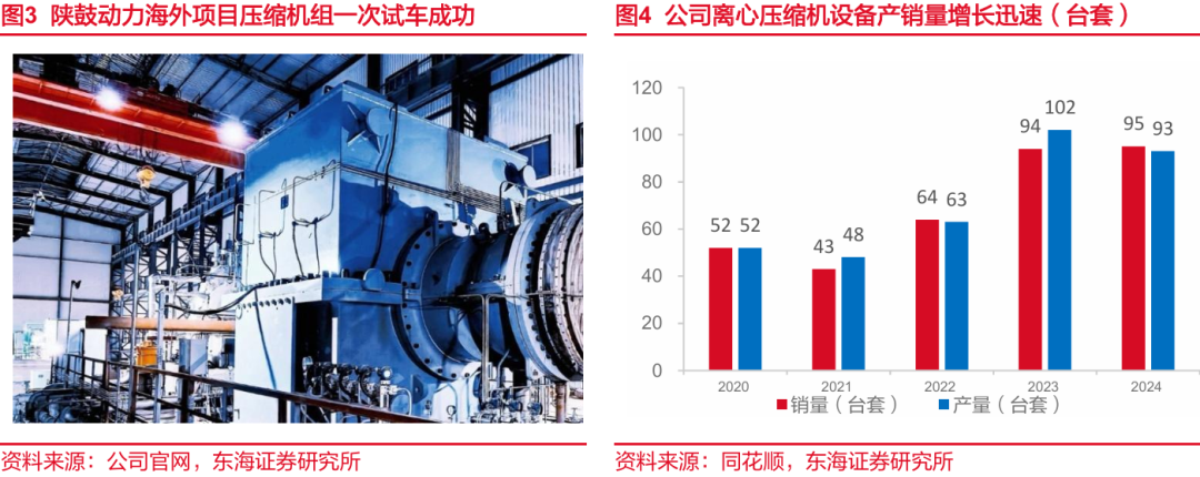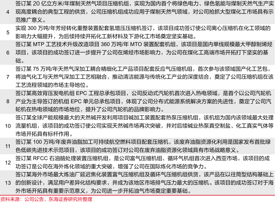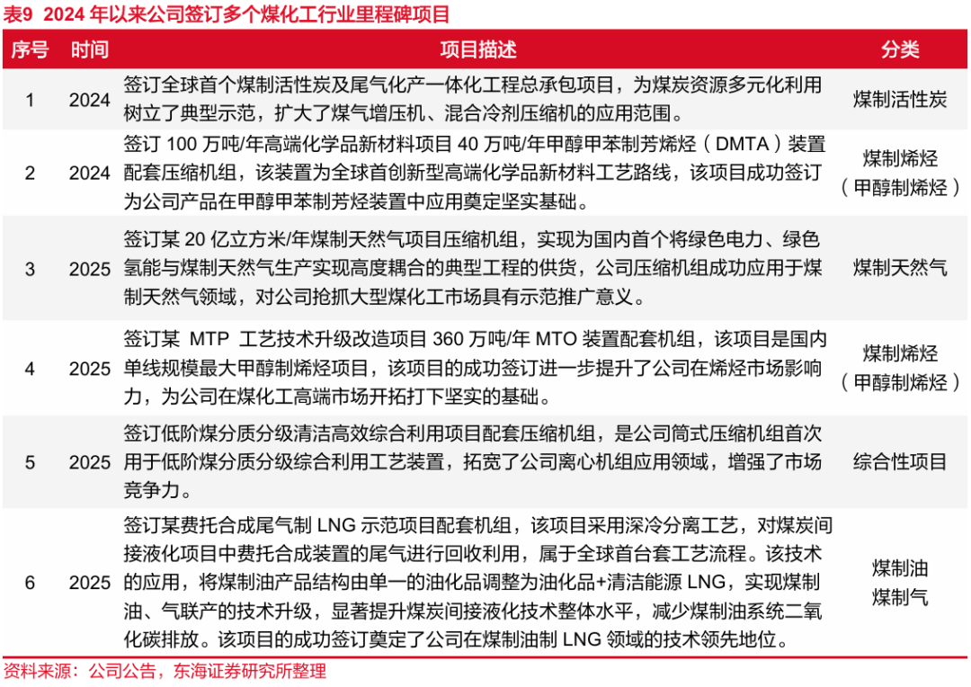 公司相关技术与设备行业领先,签订多个煤化工项目。公司生产设备受到行业广泛认可,承包陕煤榆林煤制乙二醇项目,神华包头煤制烯烃项目等多个项目的核心压缩机设备制造,其中在陕煤榆林项目中提供20台套工艺气压缩机组和专业的能量转换设备及分布式能源系统解决方案,助力该项目提前达产,创造行业新纪录。2024年以来公司煤化工业务进一步发展,签订了数个里程碑级新型煤化工项目,实现了多个煤化工方向的技术升级,实现多领域首台/套的突破,为煤化工高端市场开拓奠定基础,给公司业绩提供强劲支撑。