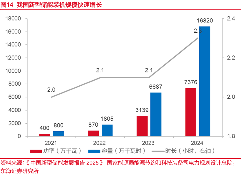 “十四五”以来我国新型储能装机规模快速增长。截至2024年底,全国已建成投运新型储能项目累计装机规模达7376万千瓦/1.68亿千瓦时,约为2021年底的20倍,较2023年底增长超过130%,全年新增新型储能装机4237万千瓦/1.01亿千瓦时。从储能时长来看,全国新型储能平均储能时长2.3小时,较2023年底增加约0.2小时,“十四五”以来储能时长呈上升趋势。
