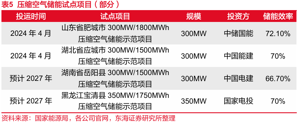 国家能源局推动新型储能多元化发展,发挥试点项目示范引领作用。2024年1月,国家能源局以公告形式发布56个新型储能试点项目,其中压缩空气储能项目11个。2024年出台的《电力储能用压缩空气储能系统技术要求》(GB/T 43687-2024)对电力储能用压缩空气储能的系统构成、技术指标、性能参数以及性能测试等方面的内容提出明确规定,为压缩空气储能电站应用提供了可量化的技术依据。