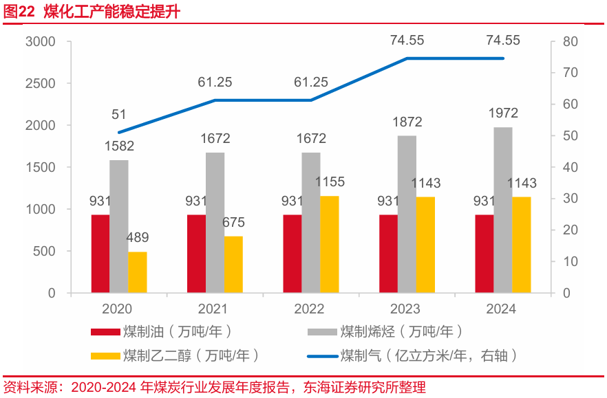 我国煤化工产能稳定提升。截止2024年,煤制油,煤制气,煤制烯烃,煤制乙二醇产能分别发展到931万吨/年、74.55亿立方米/年、1972万吨/年、1143万吨/年,其中煤制乙二醇产能增长迅速,“十四五”时期年均增长超过23%。