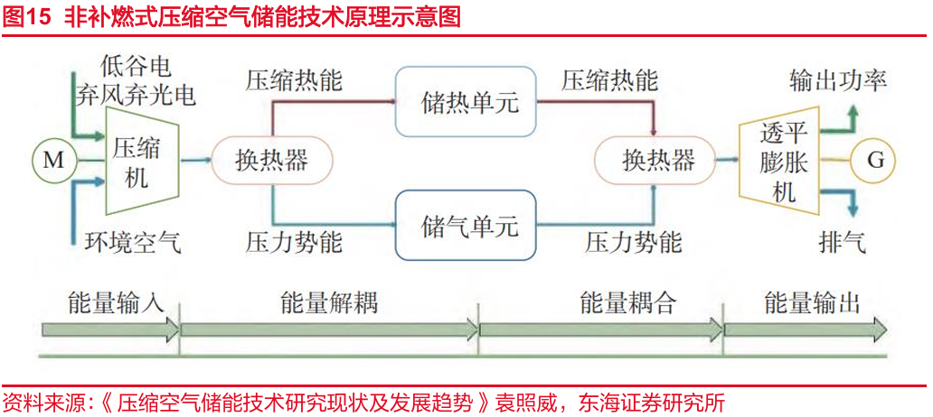压缩空气储能凭借大规模、长时长、高安全和低成本的独特优势迅速崛起。压缩空气储能是一种新型物理储能技术,以非补燃式为例,其基本原理为:利用电能驱动压缩机将空气压缩为高温高压状态,电能由此转化为空气的压力势能与热能;压缩产生的高温高压空气通过换热器与蓄热介质进行热交换,降温后的高压空气被储存于地下盐穴或储气罐中。在用电高峰时,储存的高压空气释放,并与之前储存的热能重新耦合,形成高温高压气流驱动透平膨胀机发电。该技术可以很好地平衡用电峰谷,有效地保持电力供应的稳定。