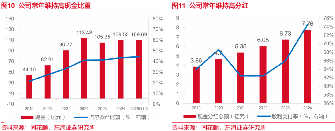 常年维持高现金比重及高现金分红。公司资产流动性良好,现金占总资产比重不断上升,截止2025年前三季度拥有现金109.69亿元,占总资产44.32%。同时,公司坚持高现金分红股利政策,2019-2024年现金分红始终占归母净利润60%以上。高分红的股利支付策略能够有效地稳定投资者信心,也侧面印证了公司财务层面稳定的现金流与较强的抗风险能力。