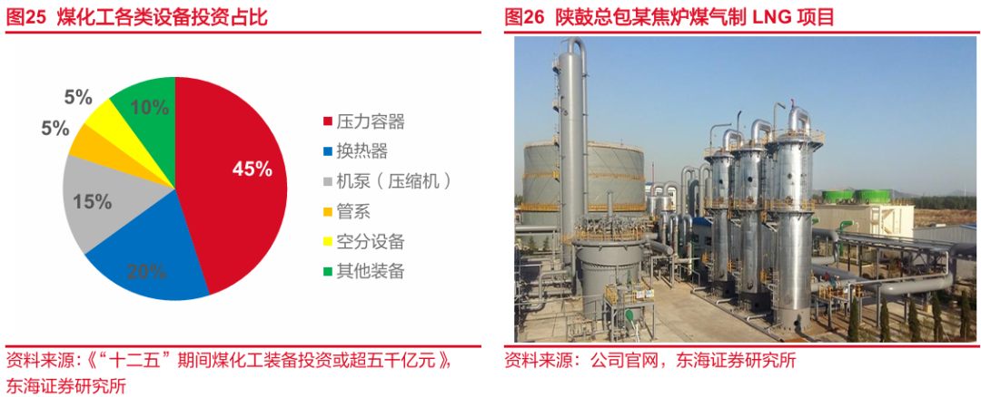 设备公司受益煤化工扩产。煤化工设备种类繁多,主要包含加氢反应器、气化炉、还原炉、换热器、盛运容器等压力容器和管道、阀门等静装备;以及泵、风机、压缩机、空分装备等动装备。一般认为煤化工设备成本占总成本50%。其中,压力容器的投资占比为45%,换热器占20%,机泵占15%,管系占5%,空分设备占5%,其他装备占10%。公司所生产设备基本能覆盖大部分压缩机泵及空分设备,生产技术领先于行业,并可以提供配套服务与解决方案,能够凭借其高质量设备渗透煤化工项目。