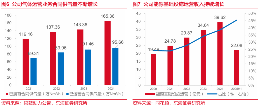 公司气体运营业务规模不断扩大,成为营收助推器与稳定器。根据2024年年报,公司当期新增气体项目投资额6.16亿元,同比增长100.73%;已拥有合同供气量165.36万Nm3/h,已运营合同供气量95.66万Nm3/h,距2021年均有较大增长;现有运营业务不断推进,已成为公司营业收入主要增长点之一,带动能源基础设施运营板块营收与占比持续增长,营收达39.62亿元,占比达38.55%;公司子公司秦风气体2025年中期营业收入创同期新高。气体运营业务的稳定增长有助于公司平衡收入结构,从而显著的提升抗周期能力,减少因下游冶金行业周期下行带来的收入波动风险。