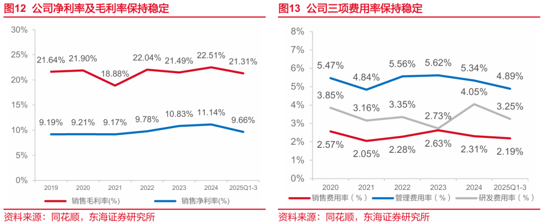根据2025 年前三季度公司情况,预计公司2025/2026/2027年管理费用率维持平稳状态,分别为5.00%/4.95%/4.90%;公司销售费用常年稳定,预计2025/2026/2027年销售费用率分别为 2.30%/2.30%/2.30%。研发费率预计随着规模效应逐步下降,但整体绝对值仍保持增长,预计2025/2026/2027年分别为3.60%/3.55%/3.53%;我们预计公司2025-2027年收入107.05亿元、114.73亿元、122.80亿元,同比增速分别为4.17%、7.17%、7.04%。预计2025-2027年公司归母净利润分别为10.74亿元、11.10亿元、11.82亿元。