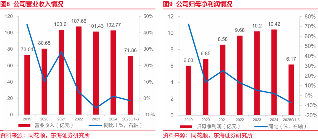 公司盈利能力保持稳定。2019-2021年公司营收从73.04亿元增长至103.61亿元,2021年至今公司营收变化幅度较小。同时,归母净利润持续增长,2019-2024年公司归母净利润由6.03亿元增长至10.42亿元,创历史新高。2025上半年营业收入及归母净利润同比略有下滑,主要系下游客户行业需求和在手项目执行进度波动所致。