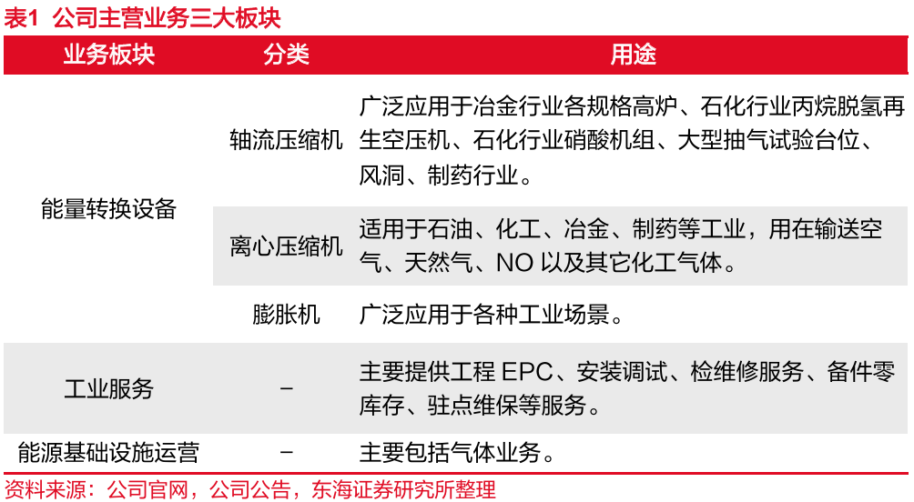 公司业务范围涵盖储能、石油化工、煤化工、冶金、有色、电力、硝酸、发酵等国民经济支柱产业以及“一带一路”、智慧城市等诸多领域,主要分为能量转换设备,工业服务,能源基础设施运营三大板块。能量转换设备覆盖轴流压缩机、离心压缩机、膨胀机三类机型,广泛应用于各种工业场景;工业服务涵盖工程EPC、安装调试、检维修服务、备件零库存、驻点维保等多个流程,打造全生命周期系统服务;能源基础设施运营主要包括气体业务。