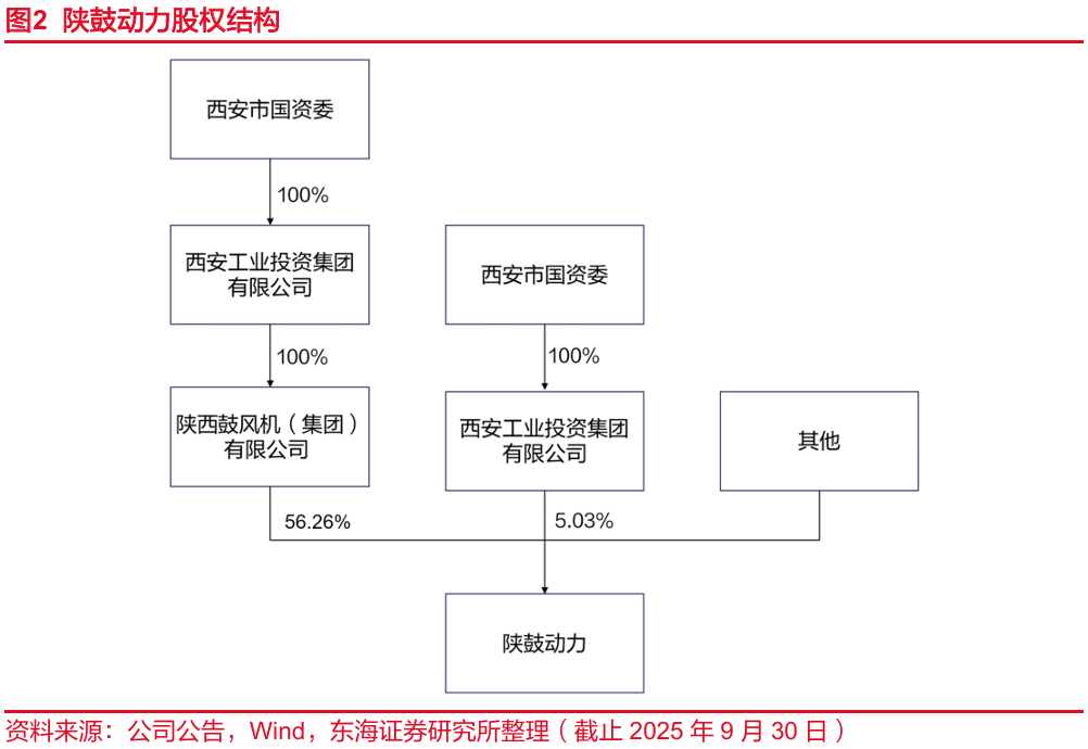 公司实际控制人为西安市国资委。截至2025年三季度,西安市国资委通过旗下100%控股的西安工业投资集团有限公司和陕西鼓风机(集团)有限公司的间接路径,合计持有陕鼓动力61.29%的股份(其中陕西鼓风机(集团)有限公司持股 56.26%,西安工业投资集团有限公司直接持股5.03%),实现对陕鼓动力的绝对控股,其余股份由其他股东持有。