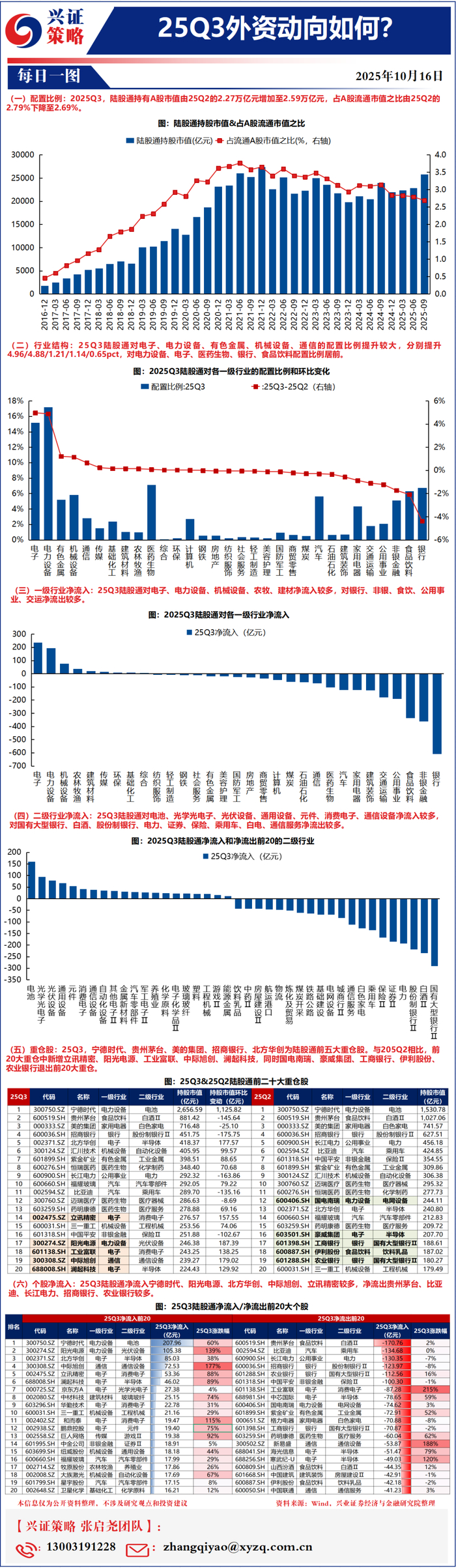 4、二级行业净流入:25Q3陆股通对电池、光学光电子、光伏设备、通用设备、元件、消费电子、通信设备净流入较多,对国有大型银行、白酒、股份制银行、电力、证券、保险、乘用车、白电、通信服务净流出较多。