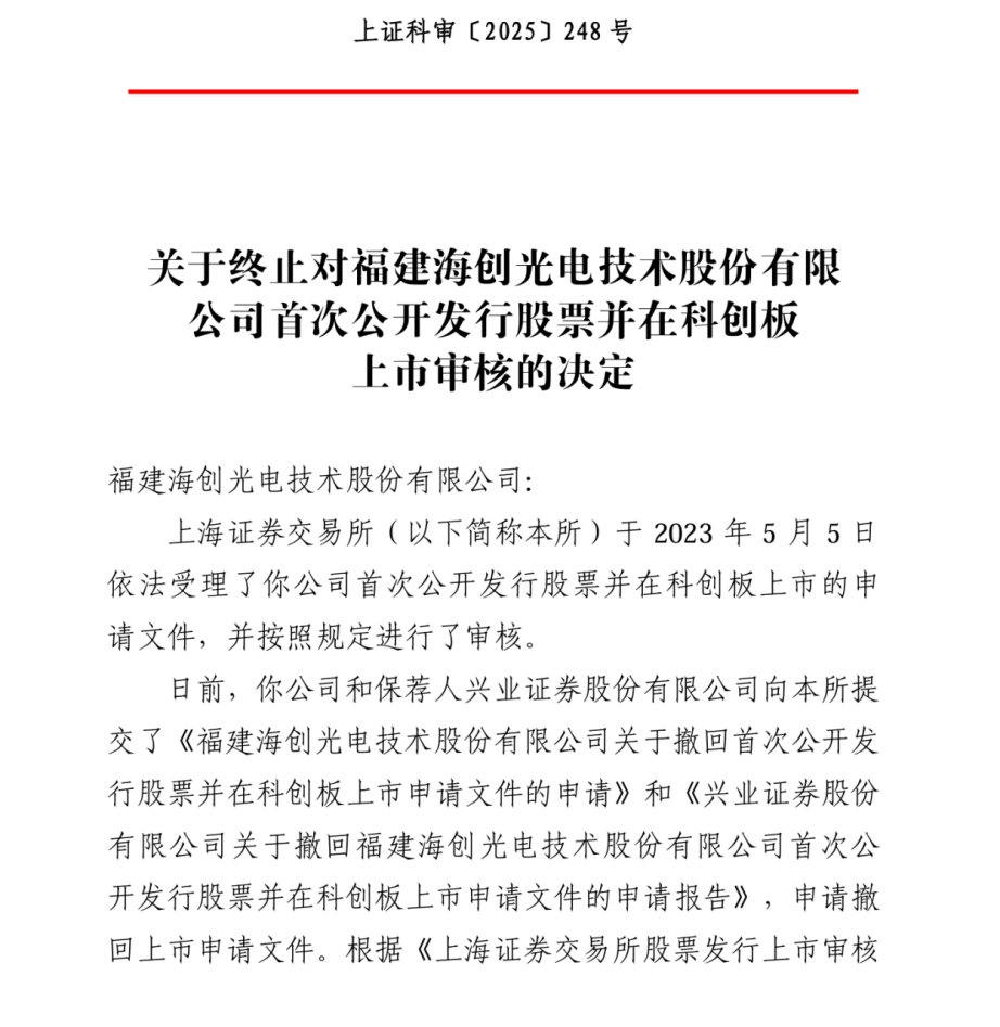 11月6日,上交所发布公告,因公司和保荐人兴业证券(601377.SH)向本所提交了撤回上市申请,上交所决定终止海创光电的IPO审核。