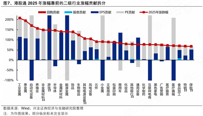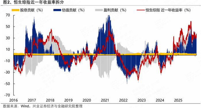 2025年恒生综指涨幅的30.98%中,盈利贡献-1.2%,估值贡献28.99%,股息贡献3.2%。