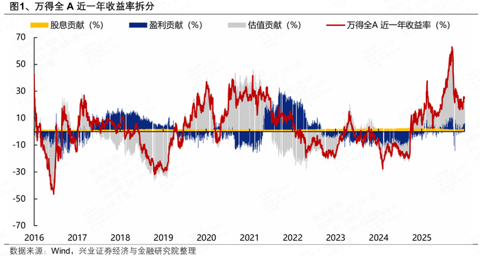 2025年全A涨幅的27.65%中,盈利贡献5.29%,估值贡献20.44%,股息贡献1.91%。