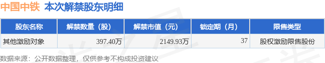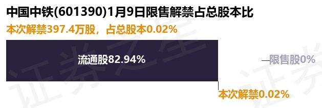 中国中铁(601390)397.4万股限售股将于1月9日解禁,占总股本0.02%