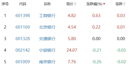 其中,工商银行、北京银行、交通银行、宁波银行、南京银行位列板块涨幅前五位,涨幅分别为0.63%、0.22%、0.00%、-0.21%、-0.26%。