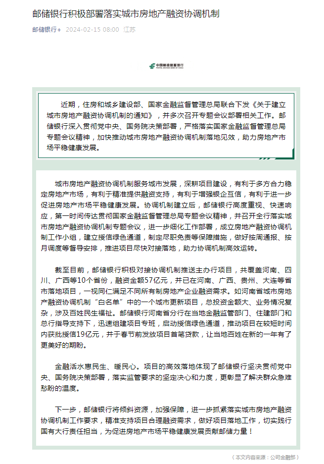截至目前,邮储银行积极对接协调机制推送主办行项目,共覆盖河南、四川、广西等10个省份,融资金额57亿元,并已在河南、广西、贵州、大连等省市落地项目,一视同仁满足不同所有制房地产企业融资需求。下一步,邮储银行将倾斜资源,加强保障,进一步抓紧落实城市房地产融资协调机制工作要求,精准支持项目合理融资需求,做好项目落地工作。