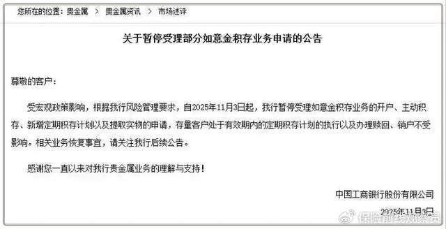 公告内容极其简单,却掀起波澜:自2025年11月3日起,工行将暂停办理部分“如意金积存”业务,涵盖开户、主动积存、新增定期积存计划以及实物提取申请。