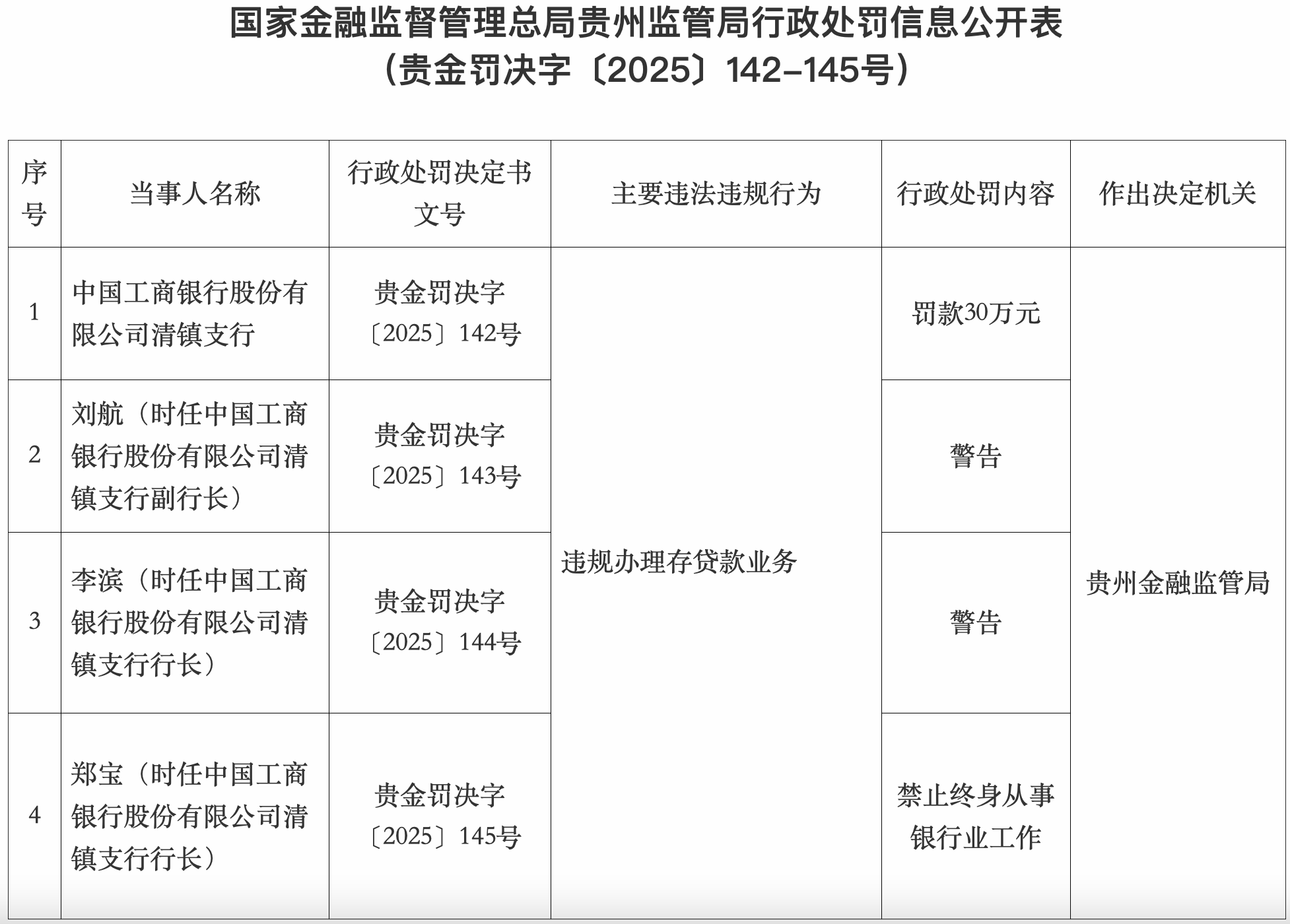 1月8日,国家金融监督管理总局贵州监管局发布的行政处罚信息显示,因违规办理存贷款业务,中国工商银行股份有限公司清镇支行被罚款30万元,刘航(时任中国工商银行(601398.SH)股份有限公司清镇支行副行长)和李滨(时任中国工商银行股份有限公司清镇支行行长)被警告,郑宝(时任中国工商银行股份有限公司清镇支行行长)被禁止终身从事银行业工作。