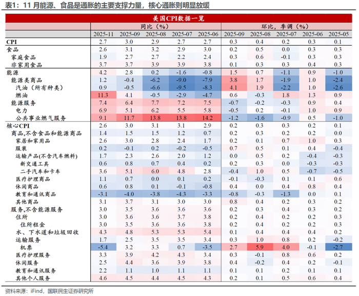 智通财经APP获悉,国联民生证券发布研报称,美国11月通胀数据给足了市场“惊喜”,从结构上来看,能源与食品通胀仍是支撑整体CPI的主要力量,核心通胀则呈现明显走弱态势。对于美联储来说,虽然11月CPI不太能改变明年1月暂缓降息的决策,但无疑会增加联储内部的鸽派声音。如果12月数据延续当前的低速上涨态势,可能会促使美联储重新审视明年的降息路径,不过一切还要等到12月更这份“干净”数据的出炉后才能下定论。