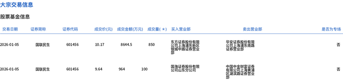1月5日,国联民生大宗交易成交950万股,成交额9608.5万元,占当日总成交额的10.25%,成交均价10.11元,较市场收盘价9.84元溢价2.79%,其中最高成交价10.17元,最低成交价9.64元。