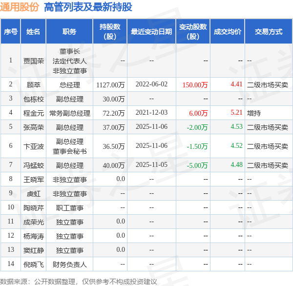 通用股份近半年内的董监高及核心技术人员增减持详情如下: