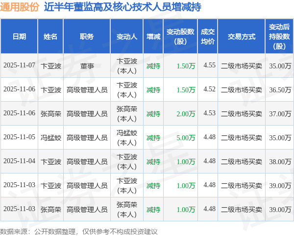 通用股份近半年内的董监高及核心技术人员增减持详情如下: