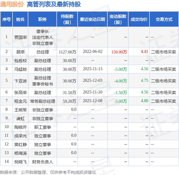 通用股份的高管列表及最新持股情况如下: