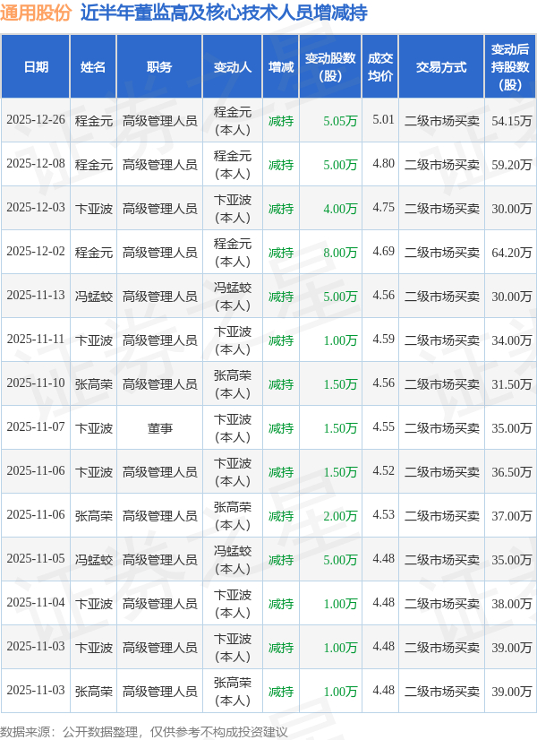 通用股份近半年内的董监高及核心技术人员增减持详情如下: