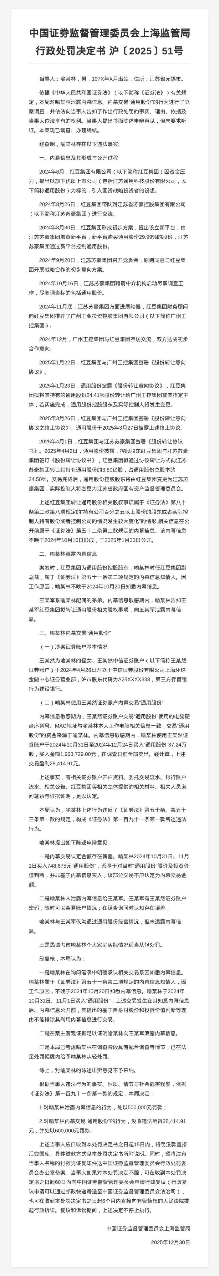 喻某林因泄露内幕信息、内幕交易“通用股份”被罚110万