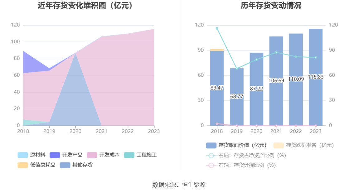 从存货变动来看,截至2023年年末,公司存货账面价值为115.83亿元,占净资产的81.46%。根据财报,公司本期没有计提存货跌价准备。