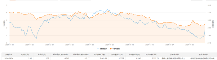 9月24日大宗交易成交2463.56万股,成交额5222.75万元,占当日总成交额的28.01%,成交价2.12元,较市场收盘价2.52元折价15.87%。