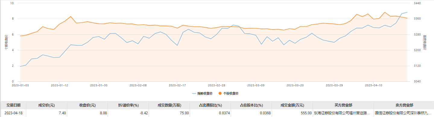 4月18日大宗交易成交75万股,成交额555万元,占当日总成交额的1.31%,成交价7.4元,较市场收盘价8.08元折价8.42%。