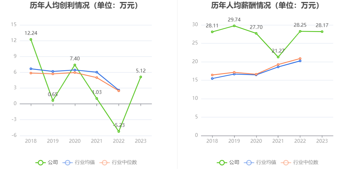 截至2023年末,公司员工总数为2001人,人均创收38.85万元,人均创利5.12万元,人均薪酬28.17万元,较上年同期分别变化-15.85%、197.96%、-0.30%。
