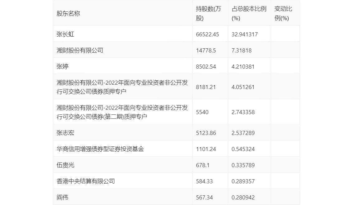年报显示,2023年年末公司十大流通股东中,持股最多的为张长虹,占比32.94%。十大流通股东名单相比2023年三季报维持不变。在具体持股比例上,湘财股份有限公司、华商信用增强债券型证券投资基金持股有所上升,香港中央结算有限公司持股有所下降。