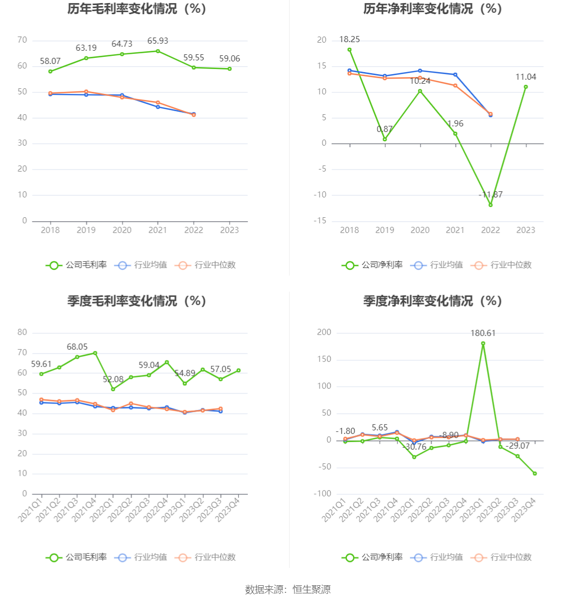 2023年,公司毛利率为59.06%,同比下降0.49个百分点;净利率为11.04%,较上年同期上升22.91个百分点。从单季度指标来看,2023年第四季度公司毛利率为61.42%,同比下降4.08个百分点,环比上升4.37个百分点;净利率为-61.41%,较上年同期下降60.11个百分点,较上一季度下降32.34个百分点。