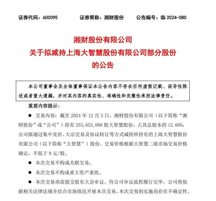 【环球网财经综合报道】12月5日,湘财股份发布公告称,为了提高公司资产使用效率和流动性,拟择机减持持有的上海大智慧股份有限公司(下称“大智慧”)股份,减持方式包括集中竞价、大宗交易及协议转让等。