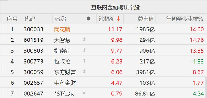大涨超11%,大智慧10CM涨停,指南针涨超9%,东方财富涨超6%,中科金财涨超4%。