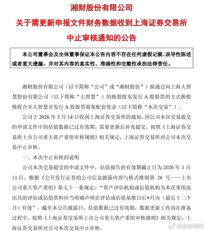 湘财股份和大智慧双双公告,上交所通知湘财股份吸收合并大智慧的审核中止,主要因此前提交的申请文件中的估值数据已过有效期,需要更新后补充提交