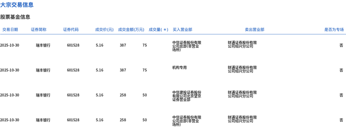 10月30日,瑞丰银行大宗交易成交250万股,成交额1290万元,占当日总成交额的12.3%,成交价5.16元,较市场收盘价5.47元折价5.67%。