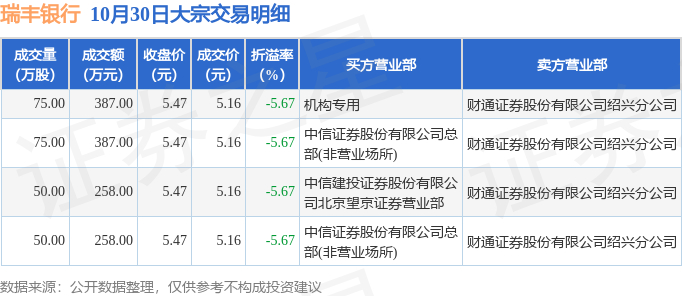 证券之星消息,10月30日瑞丰银行发生大宗交易,交易数据如下:
