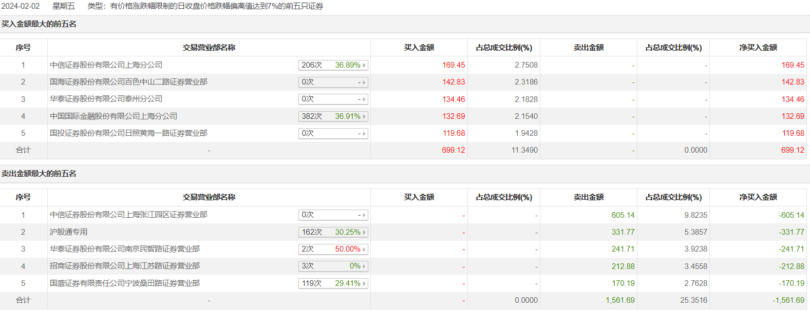 九牧王2月2日跌停,龙虎榜数据显示,上榜营业部席位全天成交2260.81万元,占当日总成交金额比例为36.7%。其中,买入金额为699.12万元,卖出金额为1561.69万元,合计净卖出862.58万元。