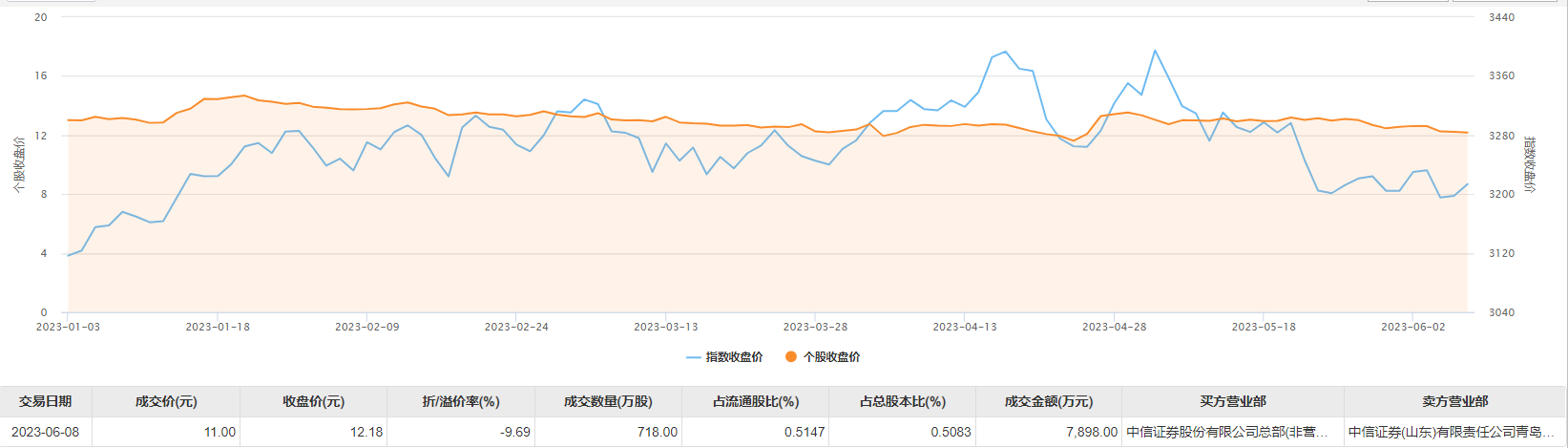 6月8日大宗交易成交718万股,成交额7898万元,占当日总成交额的58.44%,成交价11元,较市场收盘价12.18元折价9.69%。